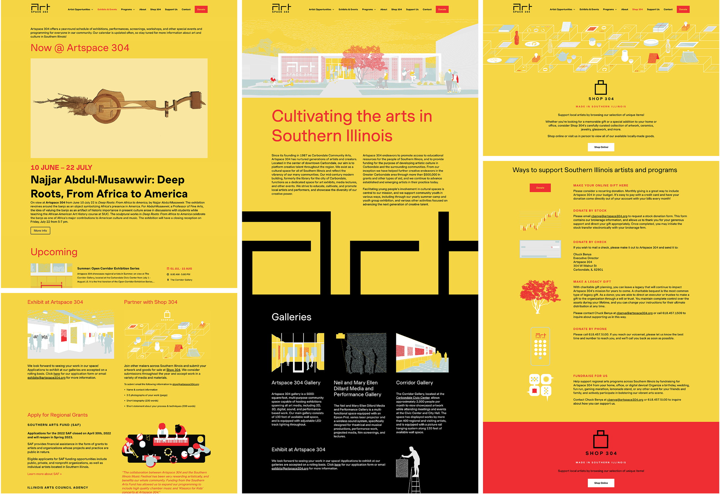 Artspace 304, formerly known as Carbondale Community Arts, sought a new brand identity and website that reflects the organization’s role as the preeminent center for art, culture and community in southern Illinois and recognition of its unique ‘recycled modernist’ building—a mid-century architectural jewel.
